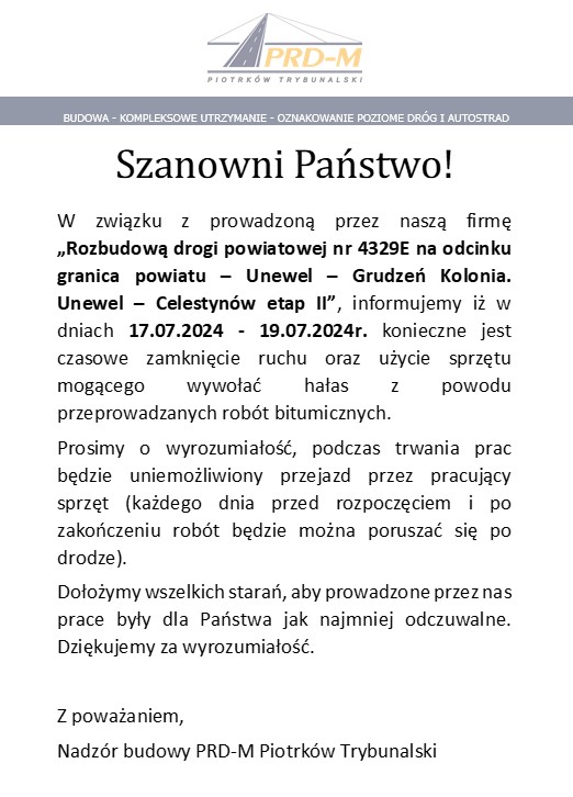 W związku z prowadzoną rozbudową drogi powiatowej nr 4329E na odcinku Unewel - Grudzeń Kolonia - Unewel - Celestynów etap II", informujem, że w dniach 17 - 19 lipca konieczne jest czasowe zamknięcie ruchu.