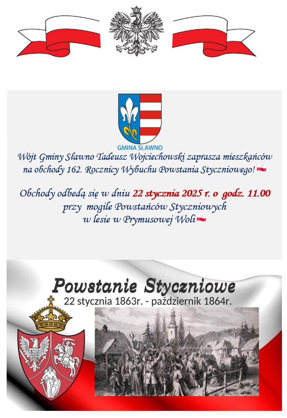 Wójt Gminy Sławno Tadeusz Wojciechowski zaprasza mieszkańców na obchody 162. Rocznicy Wybuchu Powstania Styczniowego! Obchody odbędą się w dniu 22 stycznia 2025 r. o godz. 11.00 przy mogile Powstańców Styczniowych w lesie w Prymusowej Woli.