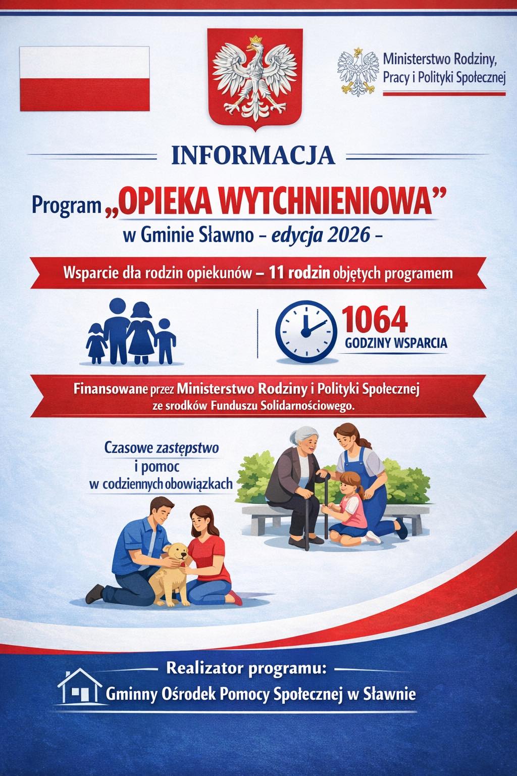 Informujemy, że na terenie Gminy Sławno realizowany jest program resortowy Ministra Rodziny i Polityki Społecznej „Opieka wytchnieniowa” dla Jednostek Samorządu Terytorialnego - edycja 2026.