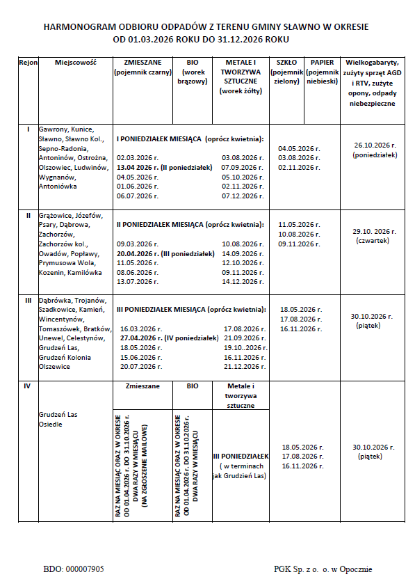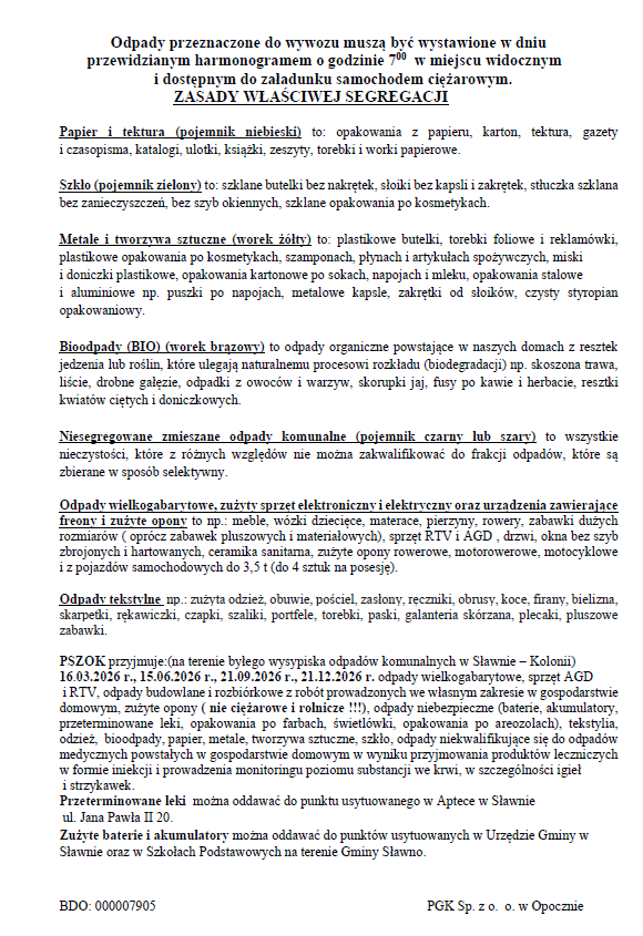 W poniższym linku aktualny HARMONOGRAM odbioru odpadów komunalnych z terenu Gminy Sławno oraz zasady segregacj:
